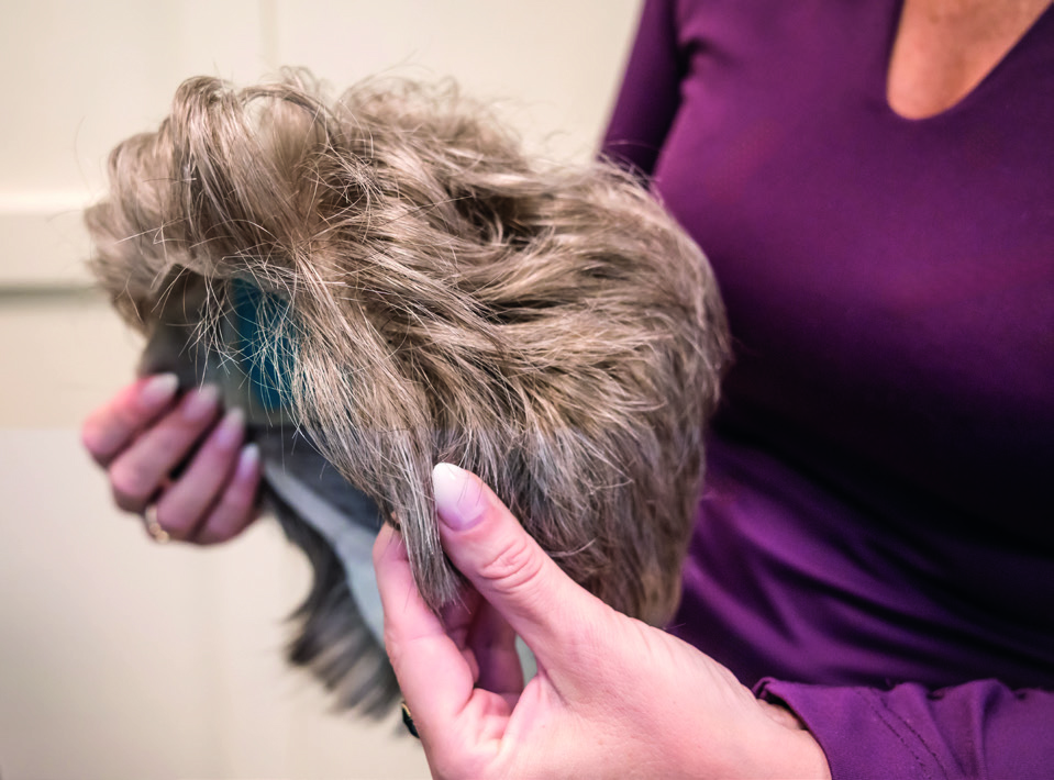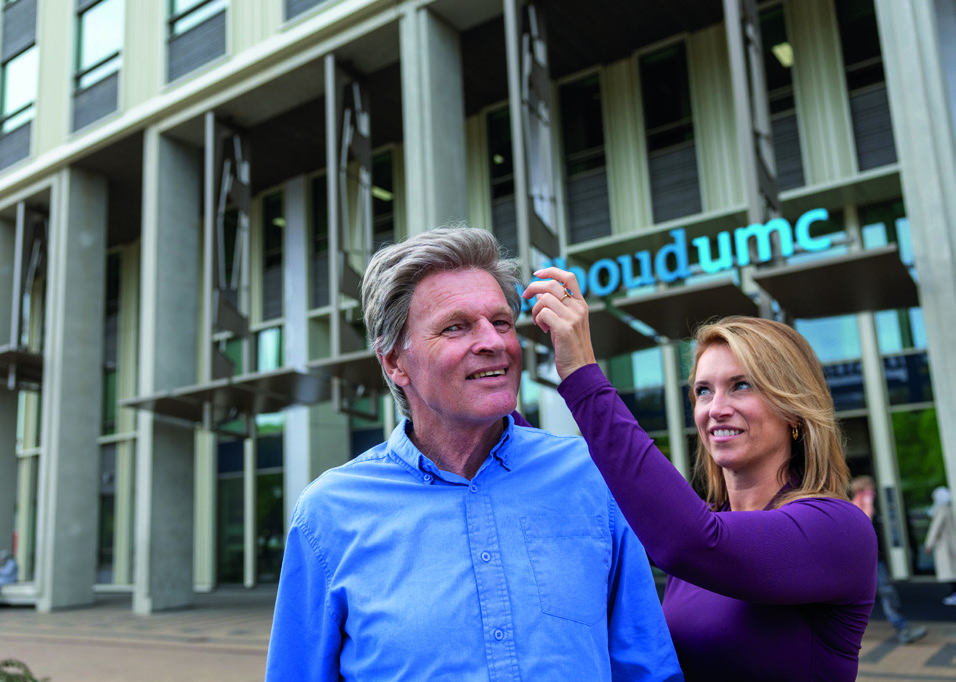 “Als alternatief voor de standaard medische helm – die wat minder geschikt is voor naar een leuk feestje – heb ik voor die meneer een maatwerkhelm ontworpen met daarop een haarwerk.” Omdat ze nog nooit een helm had gemaakt, overlegde ze daarover met de medische orthopedie. En omdat er nieuwe bloedvaten bij zijn slapen lopen, overlegde ze uitgebreid met de neurochirurg over waar de drukpunten konden komen. “Het is een comfortabele, veilige helm geworden die er natuurlijk uitziet. Hij draagt ‘m nu elke dag, omdat hij zich daardoor gewoon meer mens voelt. Die man is hartstikke blij. Daar doe ik het voor.”